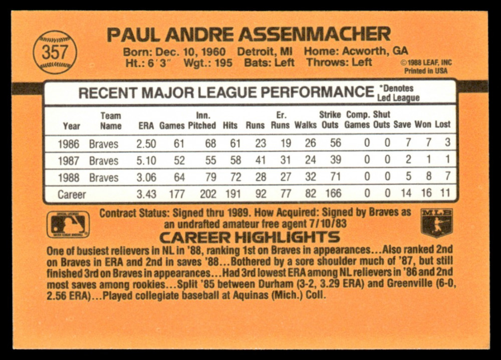 Az eladásra kínált 1989-1990 Donruss #357 Paul Assenmacher baseball kártya NM-MT állapotban van. A baseball kártyákat legtöbb esetben UP Platinum/Standard puha védőtokban és/vagy UP Toploader (kemény védőtok)-ben küldjük.