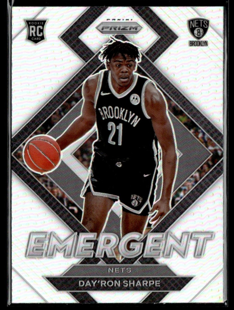 Az eladásra kínált 2021-22 Panini Prizm Emergent Silver Prizms #27 Day'Ron Sharpe kosaras kártya NM-MT állapotban van. A kosaras kártyákat legtöbb esetben UP Platinum/Standard puha védőtokban és/vagy UP Toploader (kemény védőtok)-ben küldjük.