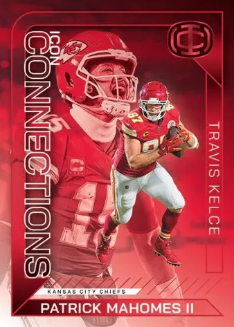 Look for cards featuring Patrick Mahomes alongside other great players in Icon Connections. Also find memorabilia sets from Patrick Mahomes like Highlight Materials and Game Gear!