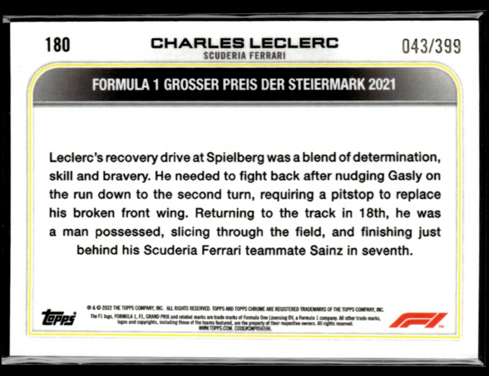 2022 Topps Chrome Formula 1 Purple Refractors GRAND PRIX DRIVER OF THE DAY #180 Charles Leclerc 043/399