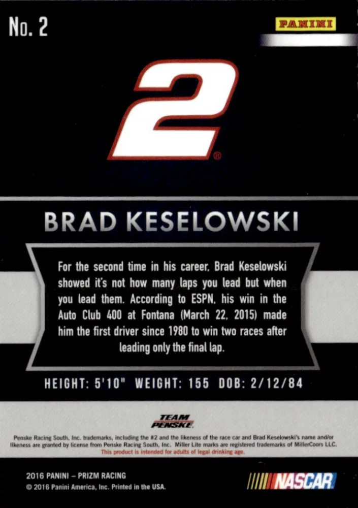 Az eladásra kínált 2016 Panini Prizm #2 Brad Keselowski Formula 1 kártya NM-MT állapotban van. A Formula1 kártyákat legtöbb esetben UP Platinum/Standard puha védőtokban és/vagy UP Toploader (kemény védőtok)-ben küldjük.