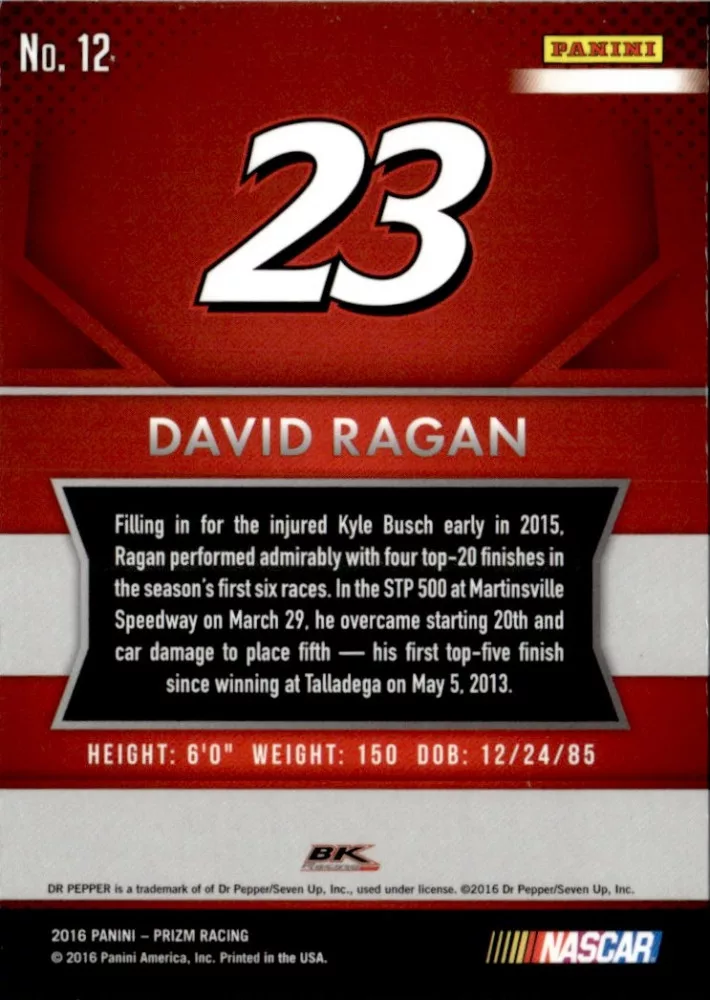 Az eladásra kínált 2016 Panini Prizm #12 David Ragan Formula 1 kártya NM-MT állapotban van. A Formula1 kártyákat legtöbb esetben UP Platinum/Standard puha védőtokban és/vagy UP Toploader (kemény védőtok)-ben küldjük.