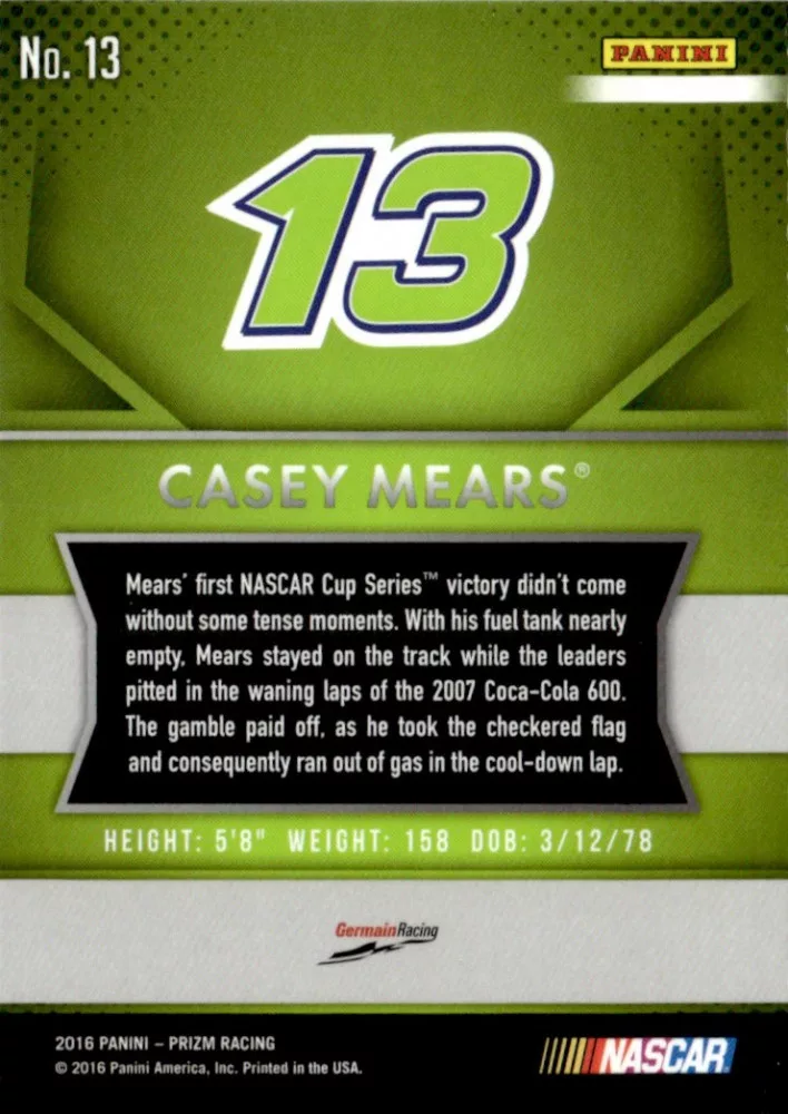 Az eladásra kínált 2016 Panini Prizm #13 Casey Mears Formula 1 kártya NM-MT állapotban van. A Formula1 kártyákat legtöbb esetben UP Platinum/Standard puha védőtokban és/vagy UP Toploader (kemény védőtok)-ben küldjük.