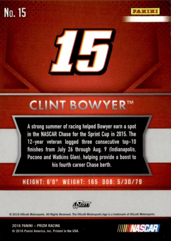 Az eladásra kínált 2016 Panini Prizm #15 Clint Bowyer Formula 1 kártya NM-MT állapotban van. A Formula1 kártyákat legtöbb esetben UP Platinum/Standard puha védőtokban és/vagy UP Toploader (kemény védőtok)-ben küldjük.