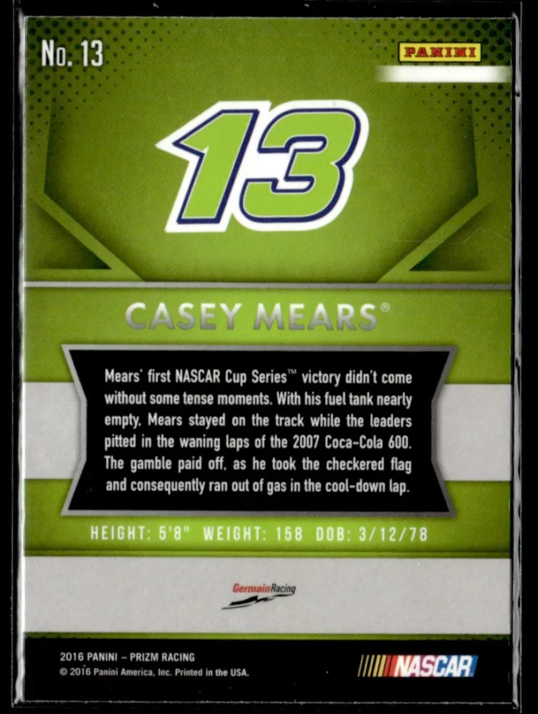 Az eladásra kínált 2016 Panini Prizm #13 Casey Mears Formula 1 kártya NM-MT állapotban van. A Formula1 kártyákat legtöbb esetben UP Platinum/Standard puha védőtokban és/vagy UP Toploader (kemény védőtok)-ben küldjük.