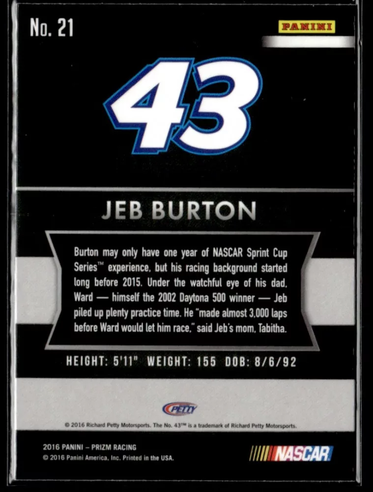 Az eladásra kínált 2016 Panini Prizm #21 Jeb Burton Formula 1 kártya NM-MT állapotban van. A Formula1 kártyákat legtöbb esetben UP Platinum/Standard puha védőtokban és/vagy UP Toploader (kemény védőtok)-ben küldjük.