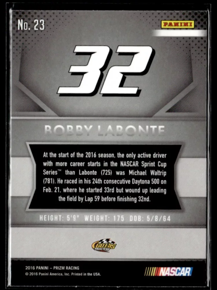 Az eladásra kínált 2016 Panini Prizm #23 Bobby Labonte Formula 1 kártya NM-MT állapotban van. A Formula1 kártyákat legtöbb esetben UP Platinum/Standard puha védőtokban és/vagy UP Toploader (kemény védőtok)-ben küldjük.