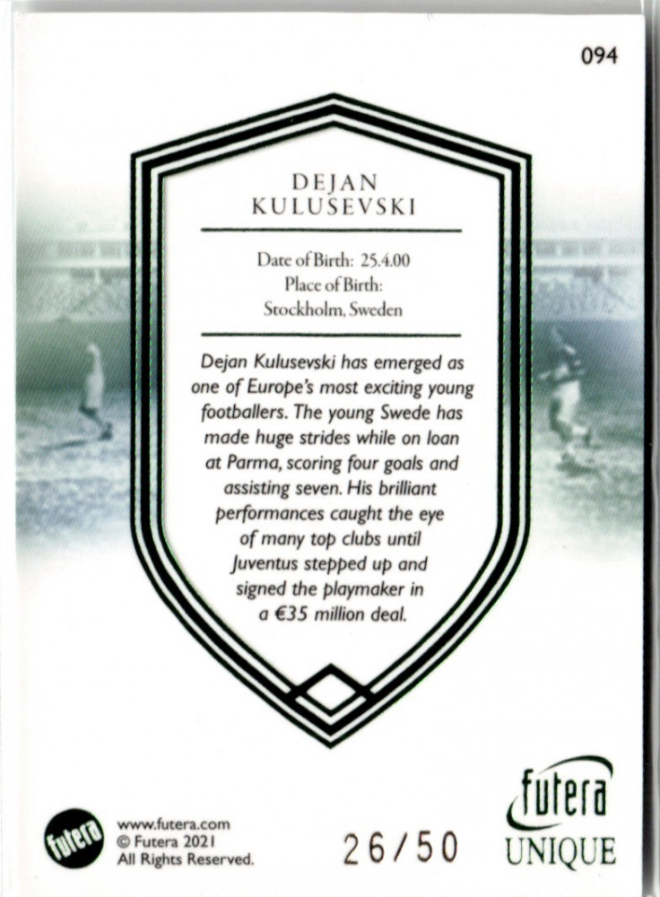 2021 Futera Unique World Football ROOKIES - Emerald #94 Dejan Kulusevski 26/50
