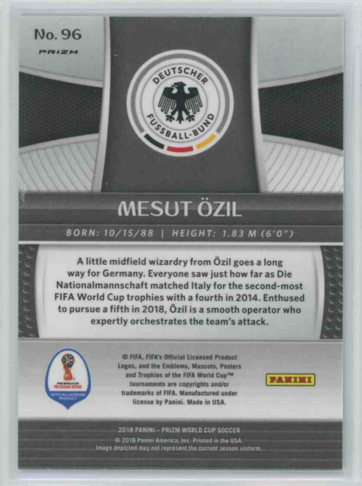 The 2017-18 Panini Prizm World Cup Soccer Base Silver #96 Mesut Ozil soccer card is in NM-MT condition or better. No visible scratches or damages on the card! It comes in sleeve or toploader, or in both in a well protected bubble envelope. Any failures on the picture is not on the soccer cards, it comes from the scanner.