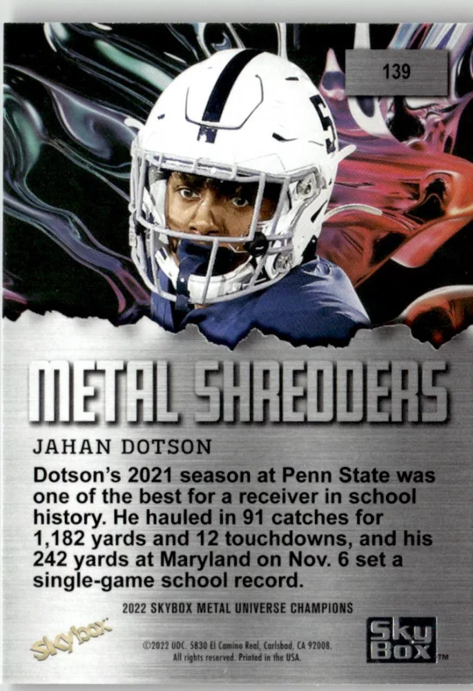 Az eladásra kínált 2022-23 Skybox Metal Universe Champions Metal Shredders #139 Jahan Dotson kártya NM-MT állapotban van. A kártyákat legtöbb esetben UP Platinum/Standard puha védőtokban és/vagy UP Toploader (kemény védőtok)-ben küldjük.