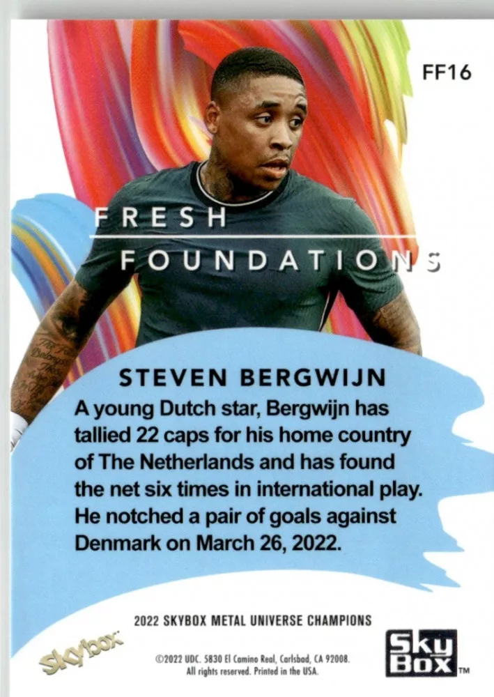 Az eladásra kínált 2022-23 Skybox Metal Universe Champions Fresh Foundation #FF16 Steven Bergwijn kártya NM-MT állapotban van. A kártyákat legtöbb esetben UP Platinum/Standard puha védőtokban és/vagy UP Toploader (kemény védőtok)-ben küldjük.