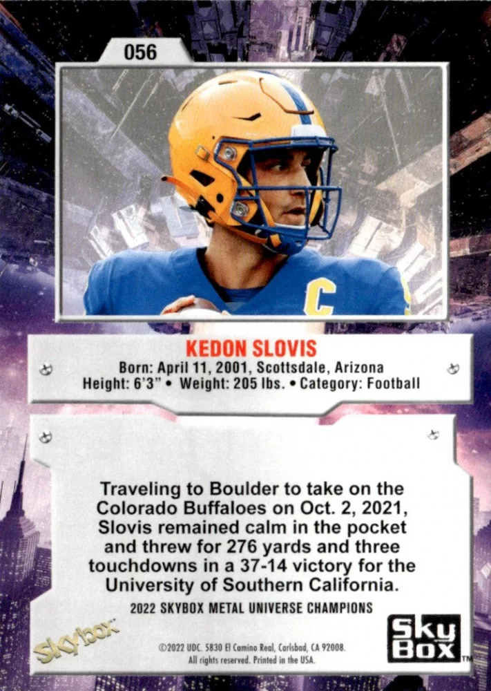 Az eladásra kínált 2022-23 Skybox Metal Universe Champions #56 Kedon Slovis kártya NM-MT állapotban van. A kártyákat legtöbb esetben UP Platinum/Standard puha védőtokban és/vagy UP Toploader (kemény védőtok)-ben küldjük.