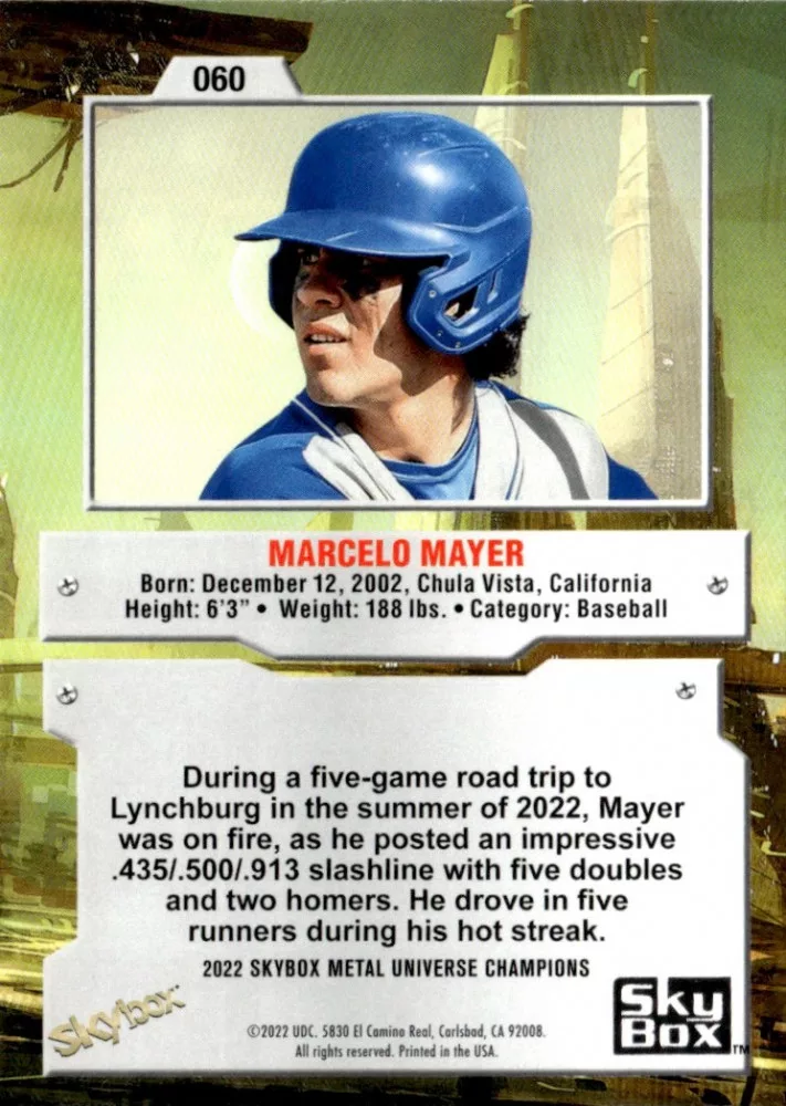 Az eladásra kínált 2022-23 Skybox Metal Universe Champions #60 Marcelo Mayer kártya NM-MT állapotban van. A kártyákat legtöbb esetben UP Platinum/Standard puha védőtokban és/vagy UP Toploader (kemény védőtok)-ben küldjük.