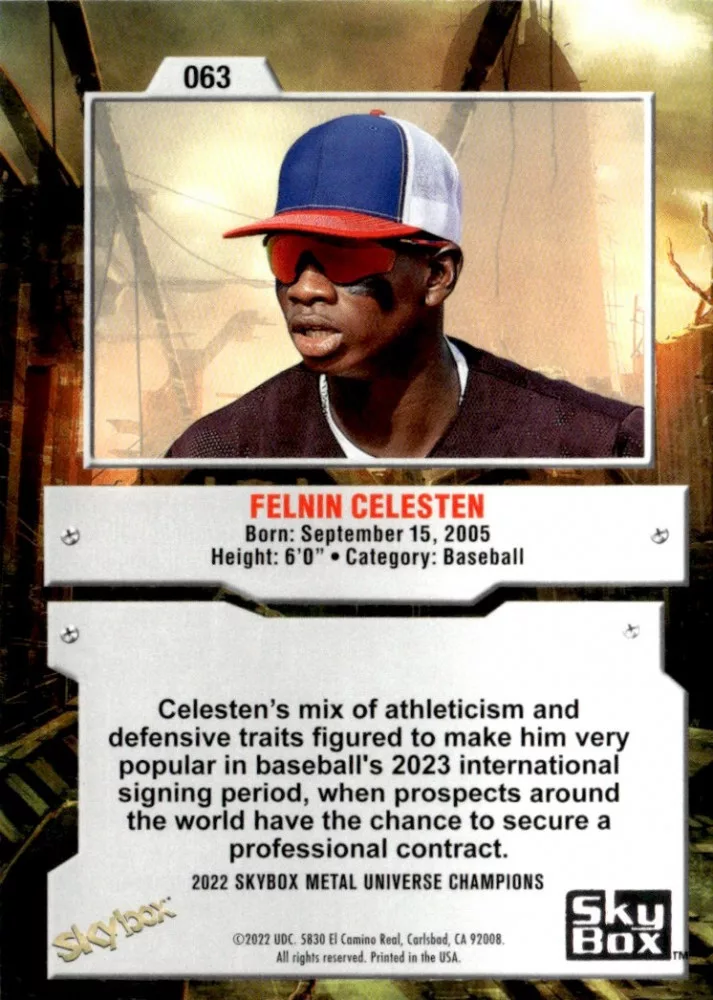 Az eladásra kínált 2022-23 Skybox Metal Universe Champions #63 Felnin Celesten kártya NM-MT állapotban van. A kártyákat legtöbb esetben UP Platinum/Standard puha védőtokban és/vagy UP Toploader (kemény védőtok)-ben küldjük.