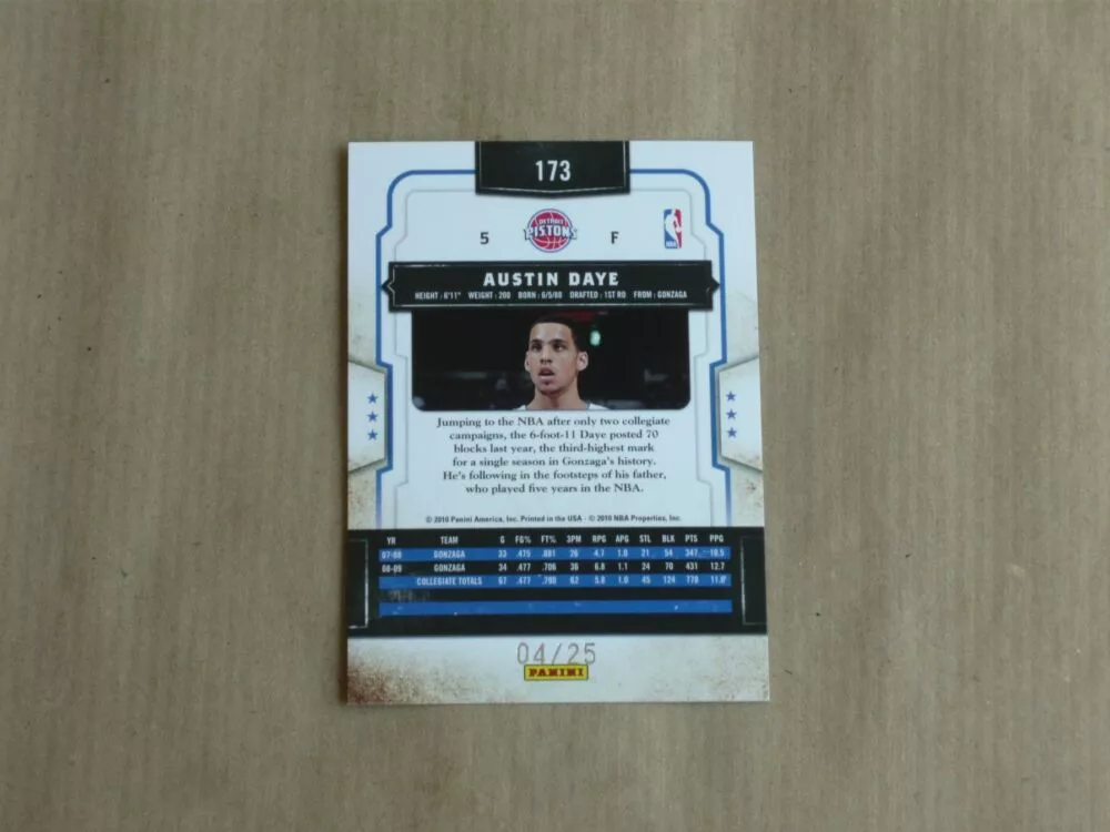 The 2009-10 Classics Timeless Threads Prime #173 Austin Daye/25 basketball card is in NM-MT condition or better. No visible scratches or damages on the card! It comes in sleeve and toploader. Optionally you can buy One-Touch holder for extra.