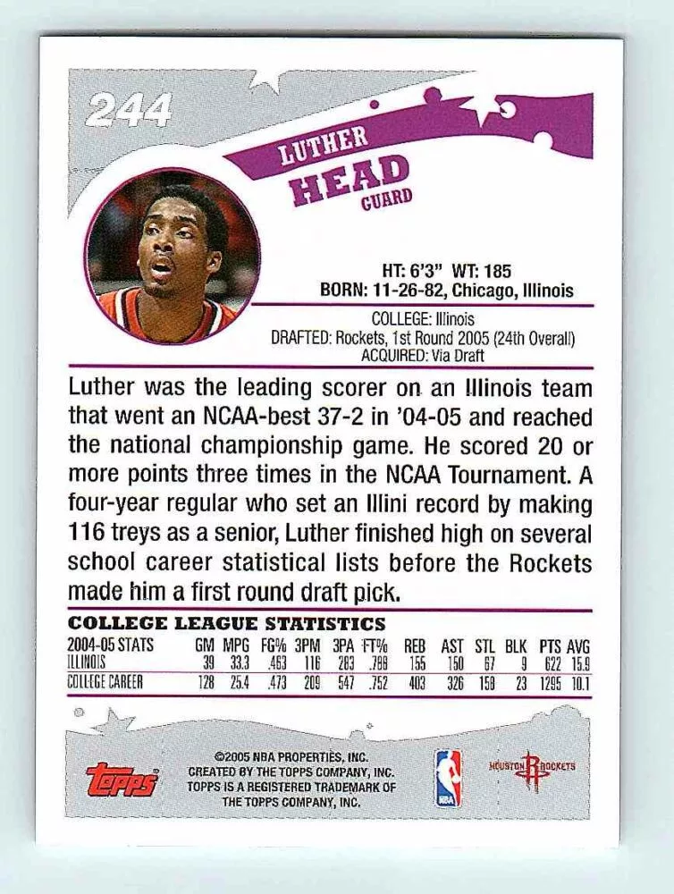 The 2005-06 Topps Basketball Base #244 Luther Head RC is in NM-MNT condition or better. The basketball cards come in sleeve and/or in toploader. Optionally you can buy One Touch holder