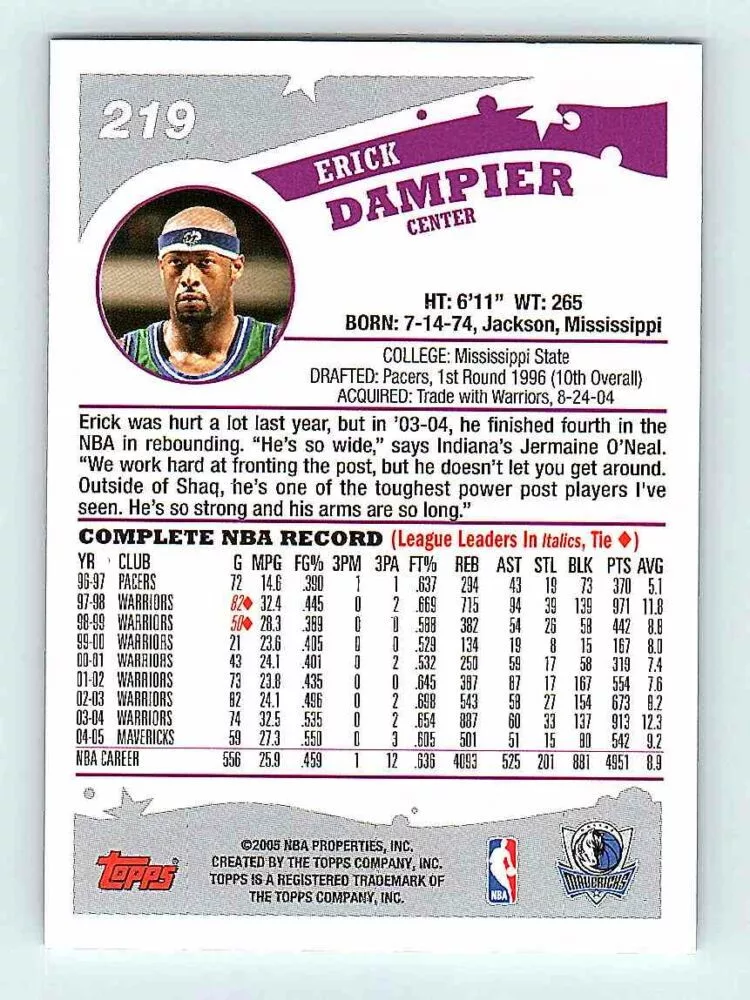 The 2005-06 Topps Basketball Base #219 Erick Dampier is in NM-MNT condition or better. The basketball cards come in sleeve and/or in toploader. Optionally you can buy One Touch holder