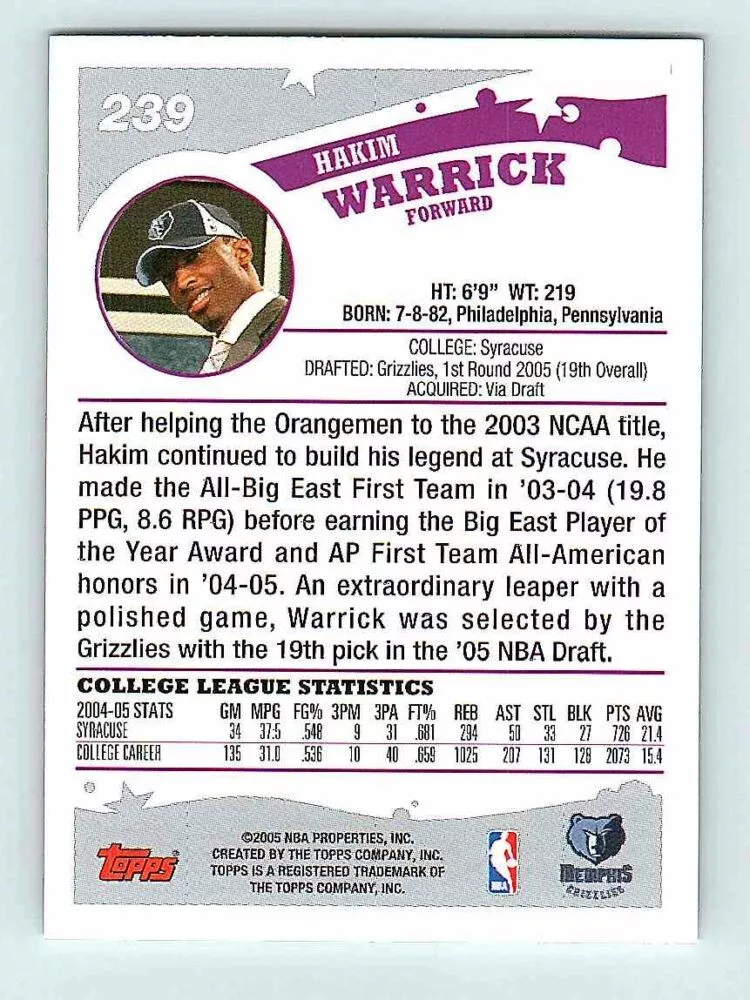 The 2005-06 Topps Basketball Base #239 Hakim Warrick RC is in NM-MNT condition or better. The basketball cards come in sleeve and/or in toploader. Optionally you can buy One Touch holder
