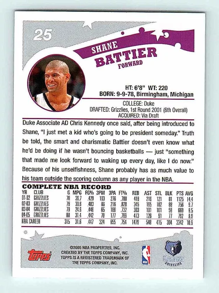 The 2005-06 Topps Basketball Base #25 Shane Battier is in NM-MNT condition or better. The basketball cards come in sleeve and/or in toploader. Optionally you can buy One Touch holder