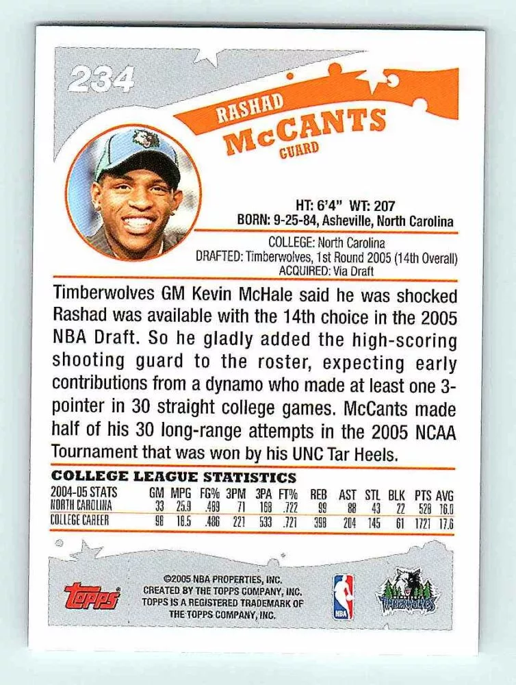 The 2005-06 Topps Basketball Base #234 Rashad McCants RC is in NM-MNT condition or better. The basketball cards come in sleeve and/or in toploader. Optionally you can buy One Touch holder