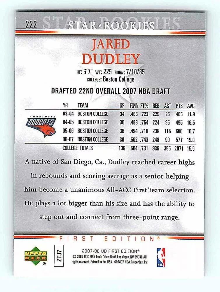 The 2007-08 Upper Deck First Edition Base #222 Jared Dudley RC is in NM-MNT condition or better. The basketball cards come in sleeve and/or in toploader. Optionally you can buy One Touch holder