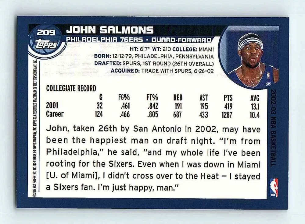 The 2002-03 Topps Basketball Base #209 John Salmons RC is in NM-MNT condition or better. The basketball cards come in sleeve and/or in toploader. Optionally you can buy One Touch holder