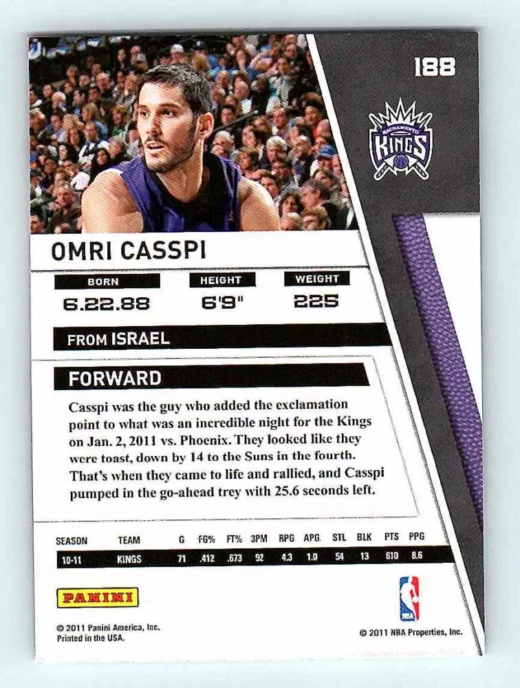 The 2010-11 Panini Season Update Base #188 Omri Casspi is in NM-MNT condition or better. The basketball cards come in sleeve and/or in toploader. Optionally you can buy One Touch holder