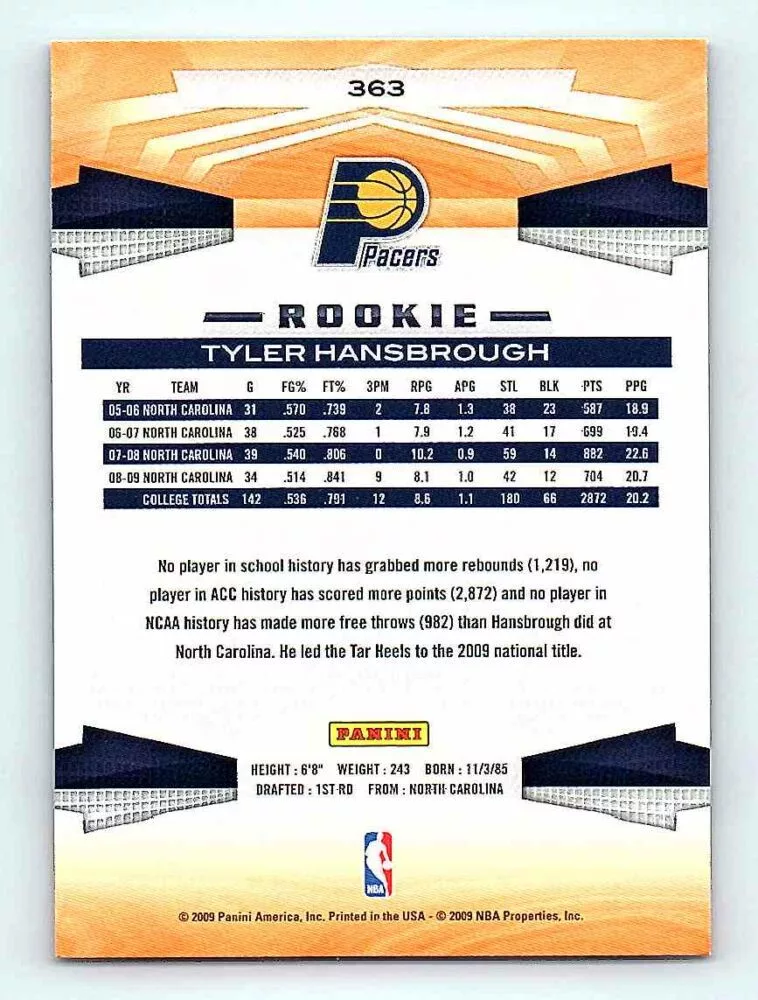 The 2009-10 Panini Basketball Base #363 Tyler Hansbrough RC is in NM-MNT condition or better. The basketball cards come in sleeve and/or in toploader. Optionally you can buy One Touch holder