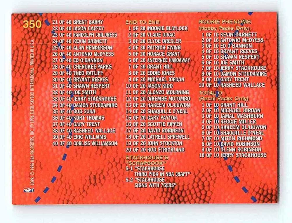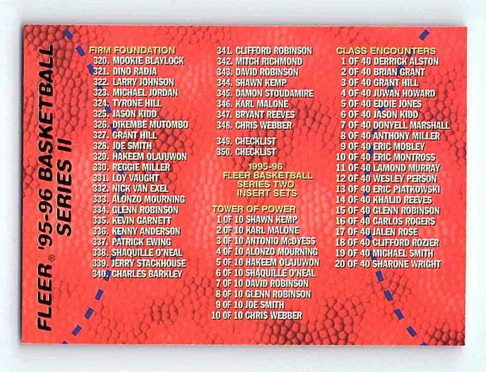 Az eladásra kínált 1995-96 Fleer Series 2 Checklist #350 Checklist kosaras kártya NM-MT, azaz majdnem tökéletes állapotban van. A focis kártyákat legtöbb esetben UP Platinum/Standard puha védőtokban és/vagy UP Toploader (kemény védőtok)-ban küldjük.