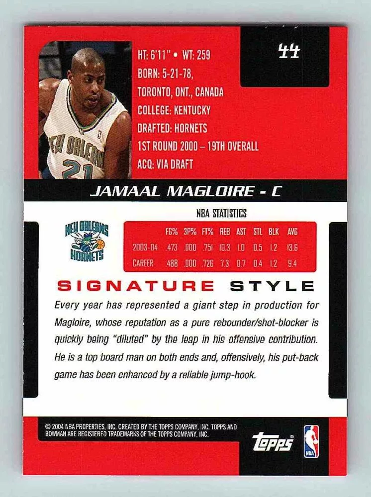The 2004-05 Bowman Signature Base #44 Jamaal Magloire basketball card is in NM-MT condition. We send the basketball cards in sleeves and/or toploaders.