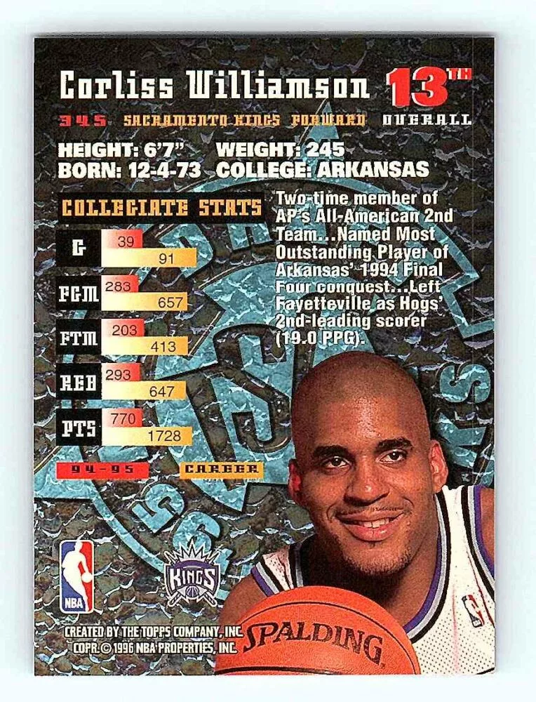 The 1995-96 Topps Stadium Club Series 2 Rookie #345 Corliss Williamson RC basketball card is in NM-MT condition. We send the basketball cards in sleeves and/or toploaders.