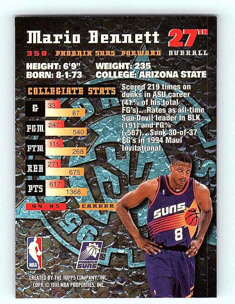 The 1995-96 Topps Stadium Club Series 2 Rookie #350 Mario Bennett RC basketball card is in NM-MT condition. We send the basketball cards in sleeves and/or toploaders.