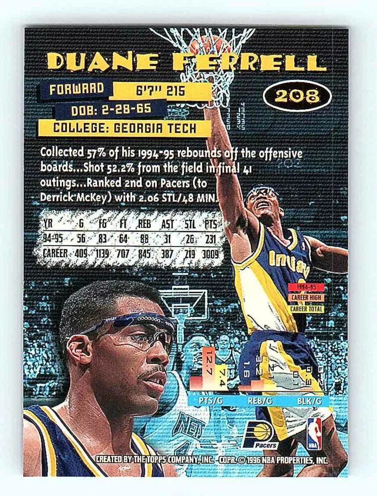 The 1995-96 Topps Stadium Club Series 2 Base #208 Duane Ferrell basketball card is in NM-MT condition. We send the basketball cards in sleeves and/or toploaders.