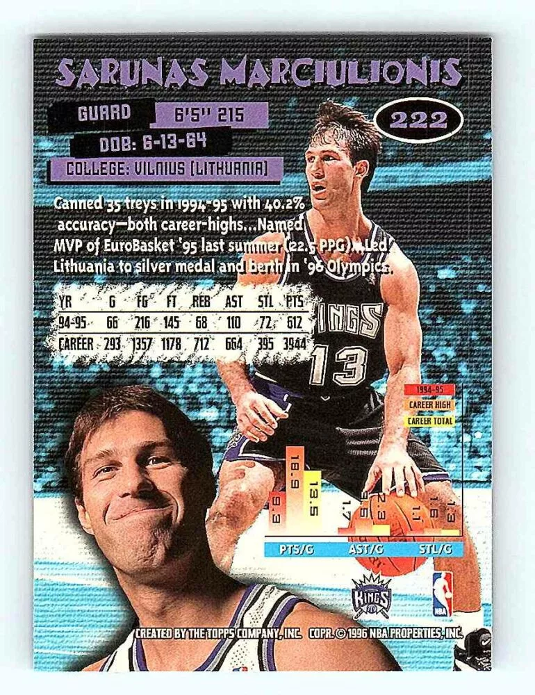 The 1995-96 Topps Stadium Club Series 2 Base #222 Sarunas Marciulionis basketball card is in NM-MT condition. We send the basketball cards in sleeves and/or toploaders.