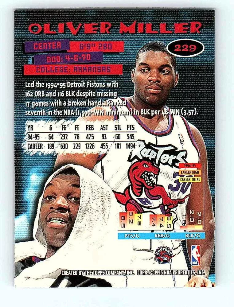 The 1995-96 Topps Stadium Club Series 2 Base #229 Oliver Miller basketball card is in NM-MT condition. We send the basketball cards in sleeves and/or toploaders.