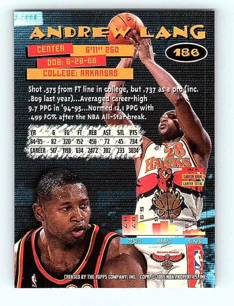 The 1995-96 Topps Stadium Club Series 2 Base #186 Andrew Lang basketball card is in NM-MT condition. We send the basketball cards in sleeves and/or toploaders.