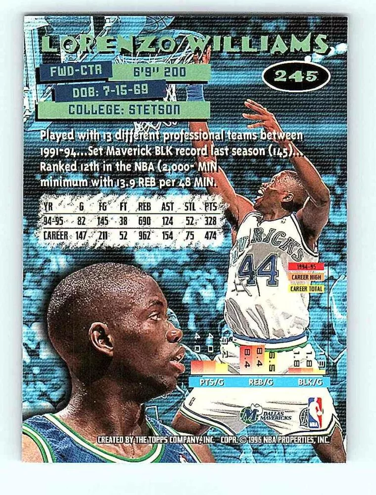 The 1995-96 Topps Stadium Club Series 2 Base #245 Lorenzo Williams basketball card is in NM-MT condition. We send the basketball cards in sleeves and/or toploaders.