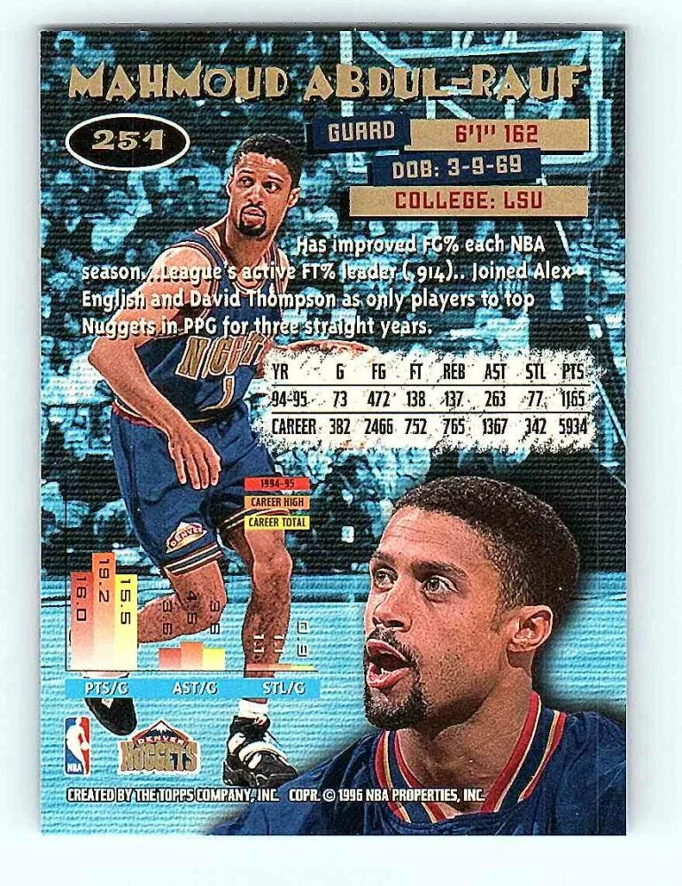 The 1995-96 Topps Stadium Club Series 2 Base #251 Mahmoud Abdul-Rauf basketball card is in NM-MT condition. We send the basketball cards in sleeves and/or toploaders.