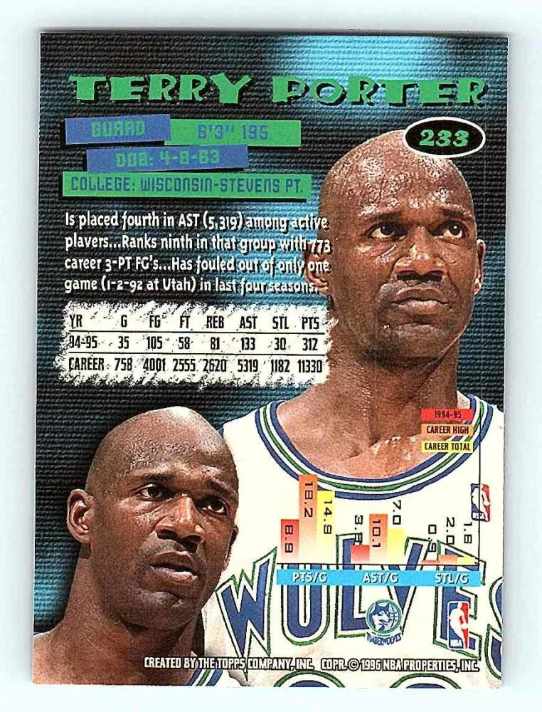 The 1995-96 Topps Stadium Club Series 2 Base #233 Terry Porter basketball card is in NM-MT condition. We send the basketball cards in sleeves and/or toploaders.