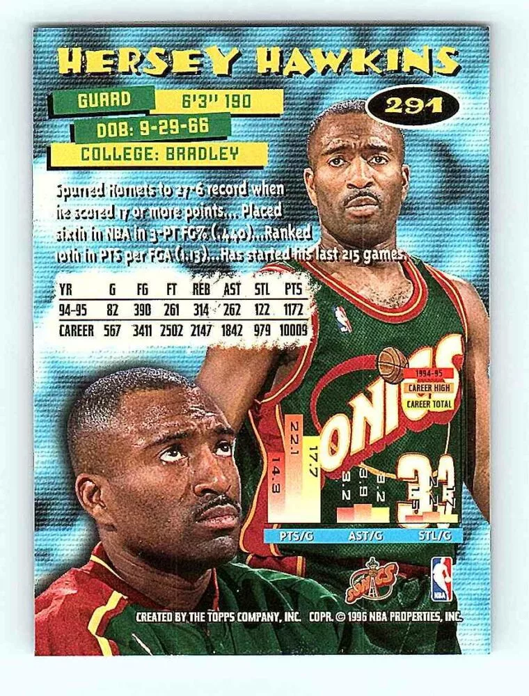 The 1995-96 Topps Stadium Club Series 2 Base #291 Hersey Hawkins basketball card is in NM-MT condition. We send the basketball cards in sleeves and/or toploaders.