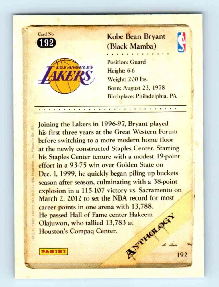 2012 Kobe Anthology Base # 192 Kobe Bryant