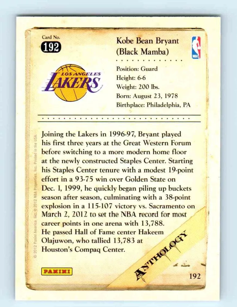 2012 Kobe Anthology Base # 192 Kobe Bryant