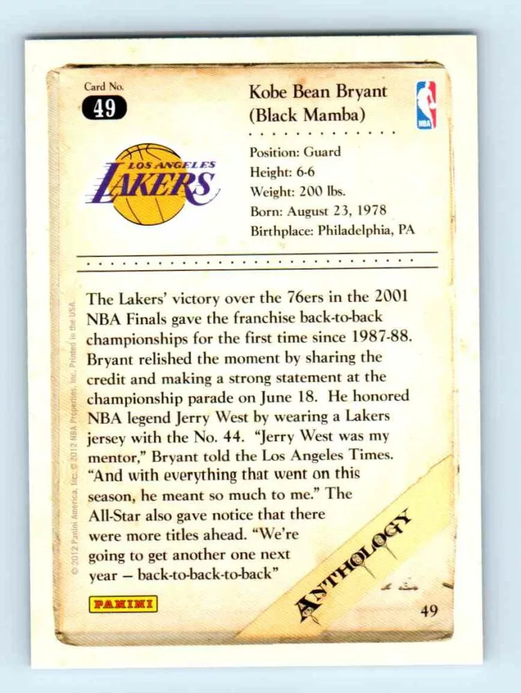 2012 Kobe Anthology Base # 49 Kobe Bryant