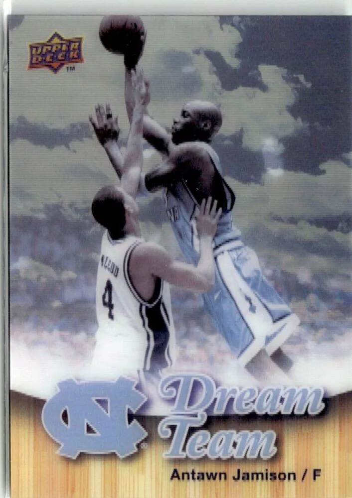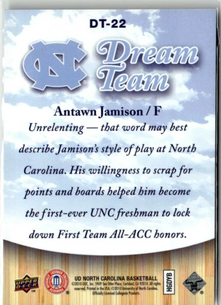 The 2010-11 Upper Deck North Carolina Dream Team 3D # DT-22 Antawn Jamison basketball card is in NM-MT condition or better. No visible scratches or damages on the card! It comes in sleeve and toploader. Optionally you can buy One-Touch holder for extra.