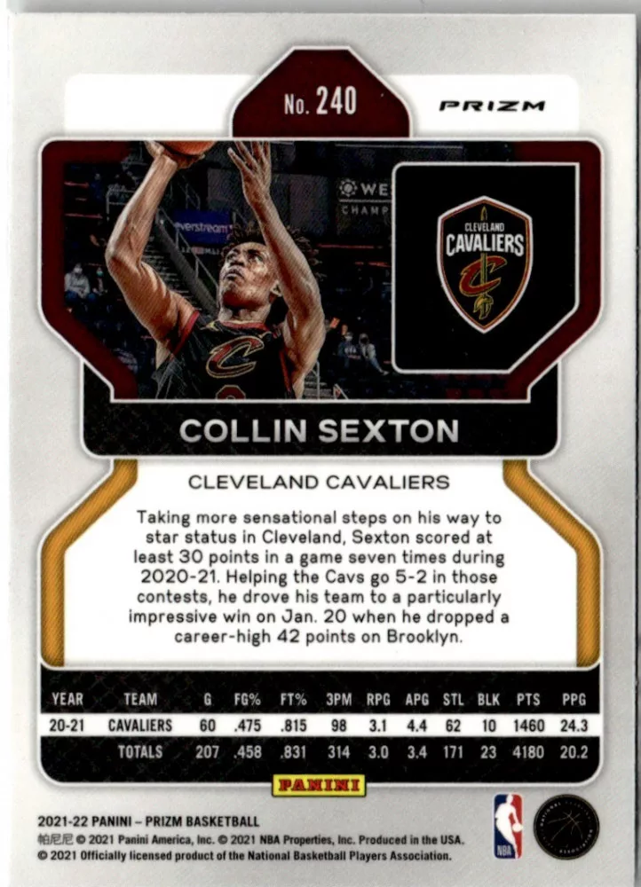 Az eladásra kínált 2021-22 Panini Prizm Silver Prizms #240 Collin Sexton kosaras kártya NM-MT állapotban van. A kosaras kártyákat legtöbb esetben UP Platinum/Standard puha védőtokban és/vagy UP Toploader (kemény védőtok)-ben küldjük.