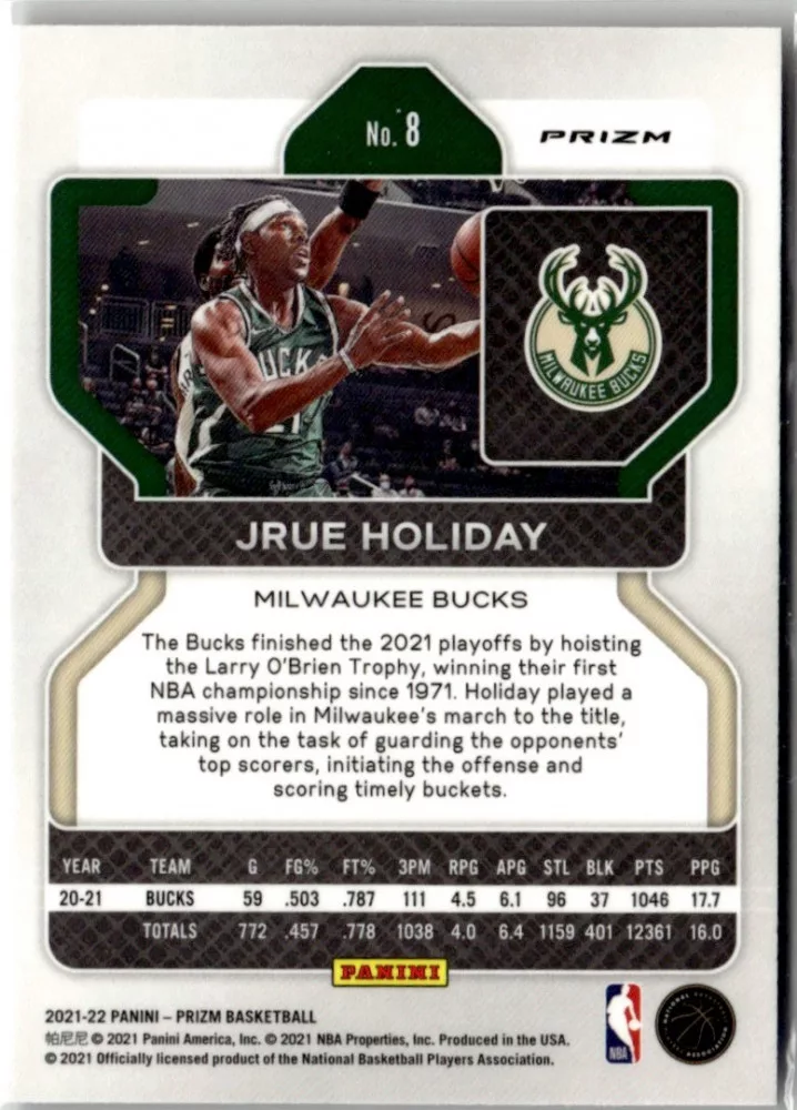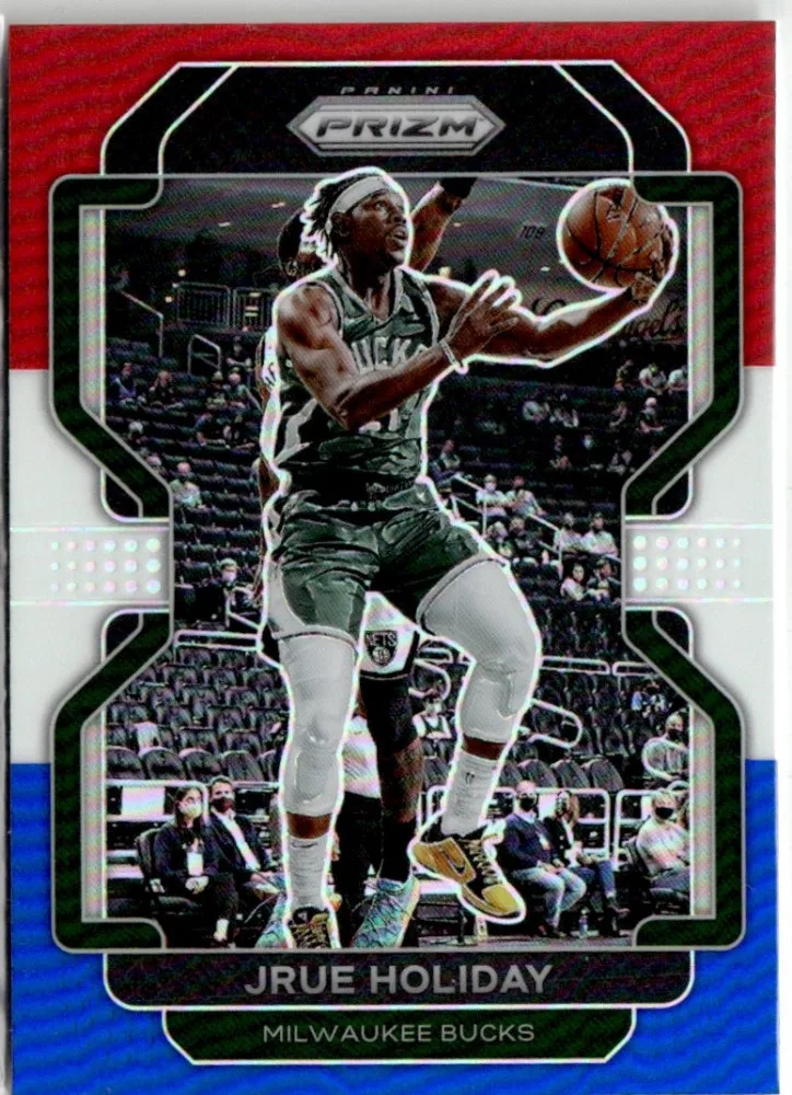 Az eladásra kínált 2021-22 Panini Prizm Red White and Blue Prizms #8 Jrue Holiday kosaras kártya NM-MT állapotban van. A kosaras kártyákat legtöbb esetben UP Platinum/Standard puha védőtokban és/vagy UP Toploader (kemény védőtok)-ben küldjük.