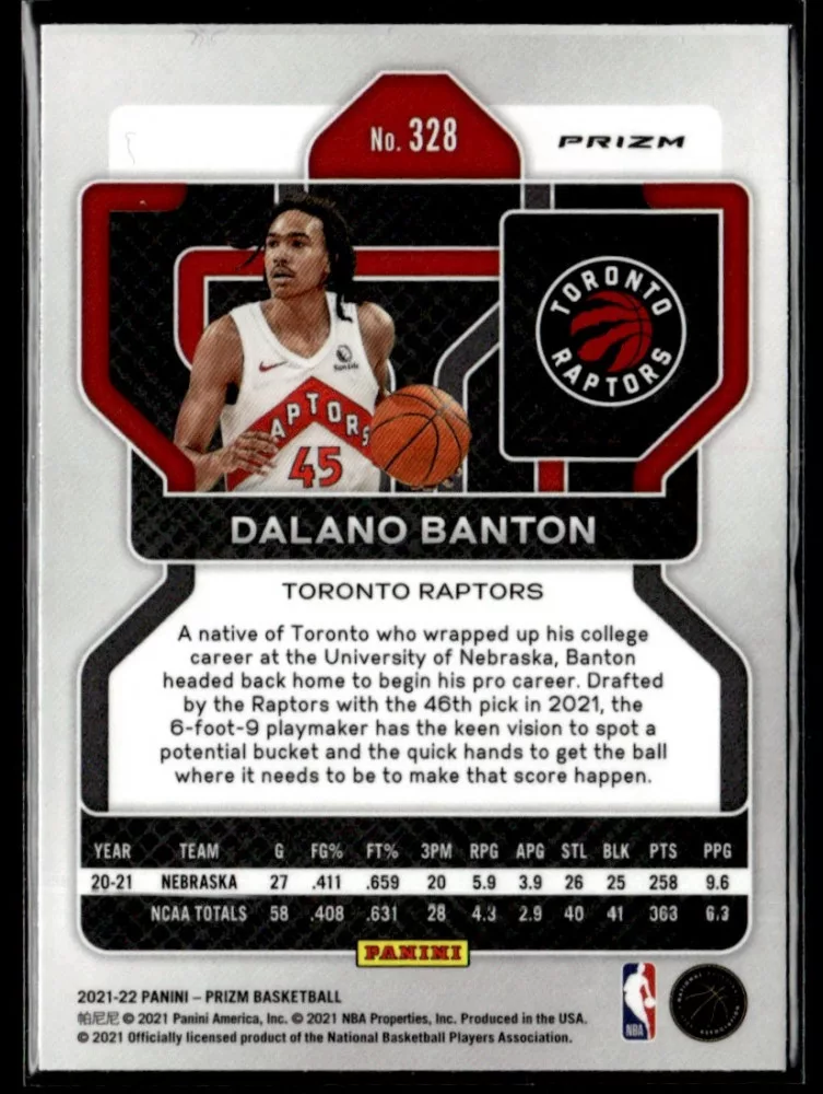 Az eladásra kínált 2021-22 Panini Prizm Red White and Blue Prizms #328 Dalano Banton kosaras kártya NM-MT állapotban van. A kosaras kártyákat legtöbb esetben UP Platinum/Standard puha védőtokban és/vagy UP Toploader (kemény védőtok)-ben küldjük.