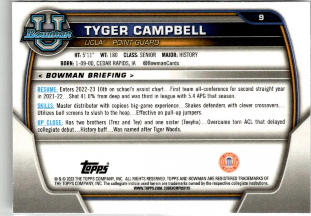 2022-23 Bowman Chrome University  #9 Tyger Campbell