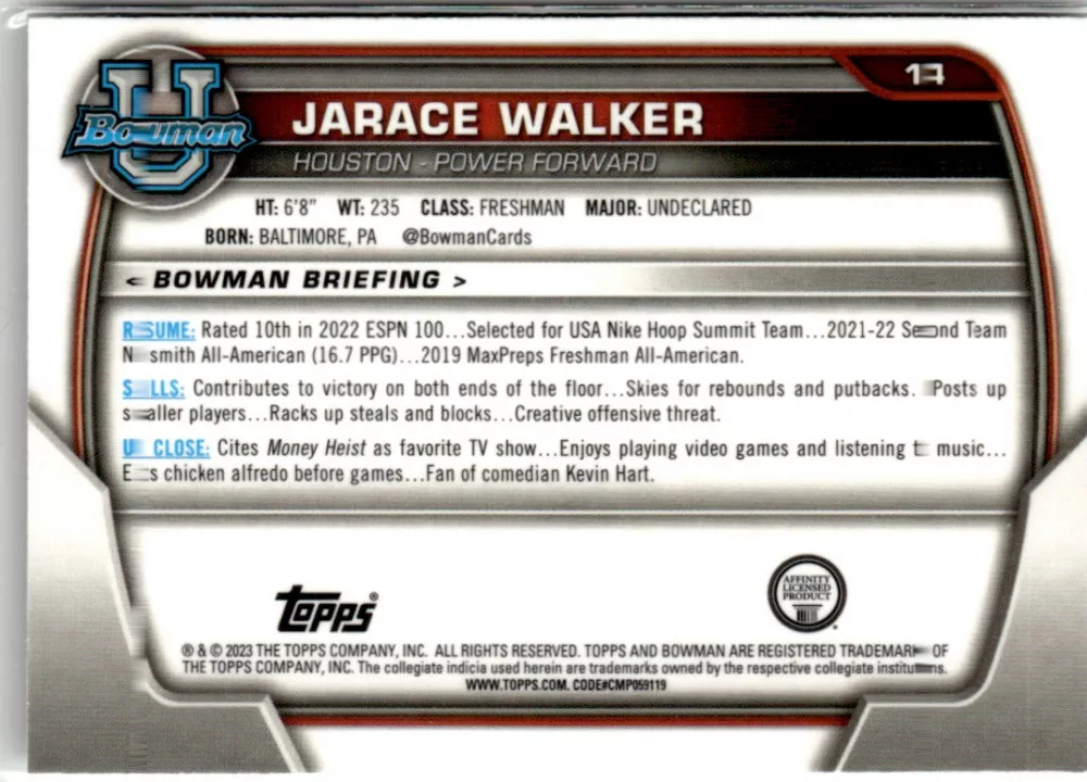 Az eladásra kínált 2022-23 Bowman Chrome University #14 Jarace Walker kosaras kártya NM-MT állapotban van. A kosaras kártyákat legtöbb esetben UP Platinum/Standard puha védőtokban és/vagy UP Toploader (kemény védőtok)-ben küldjük.