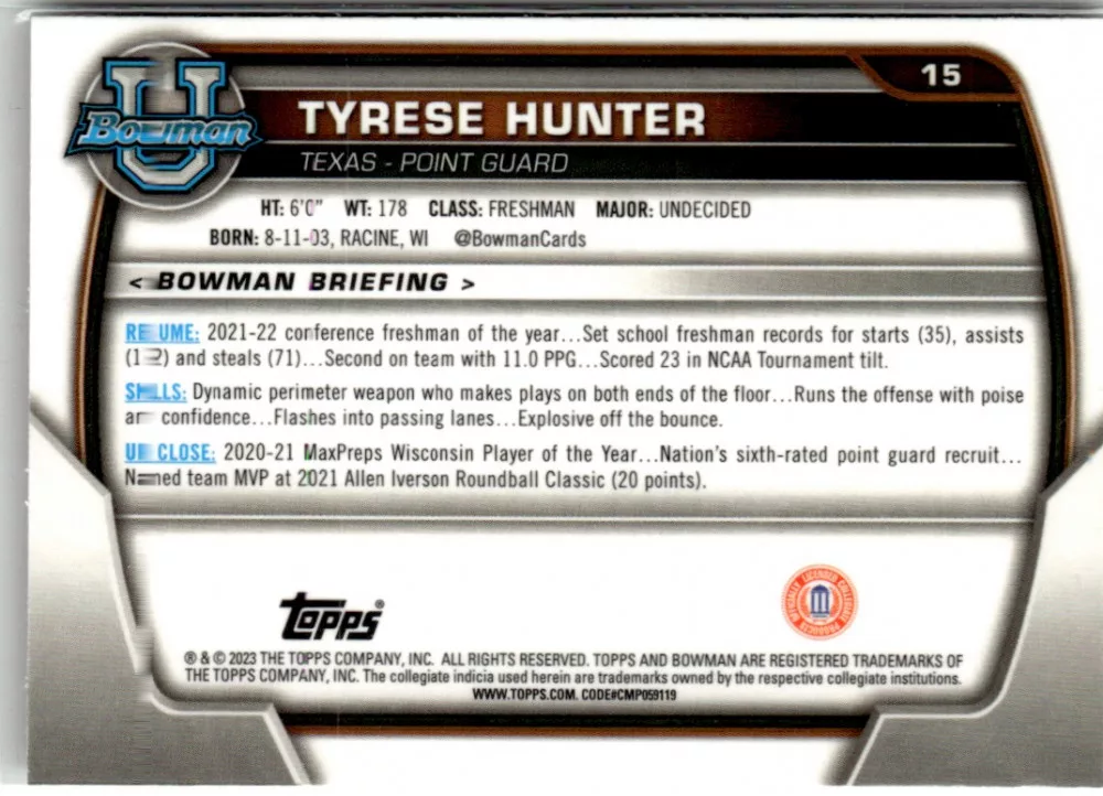 2022-23 Bowman Chrome University  #15 Tyrese Hunter